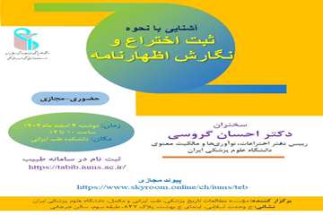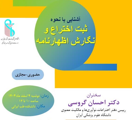 کارگاه آموزشی «آشنایی با نحوه ثبت اختراع و نگارش اظهارنامه» روز دوشنبه ۴ اسفند ۱۴۰۴ در دانشکده طب ایرانی برگزار خواهد شد. برگزاری به صورت حضوری و مجازی